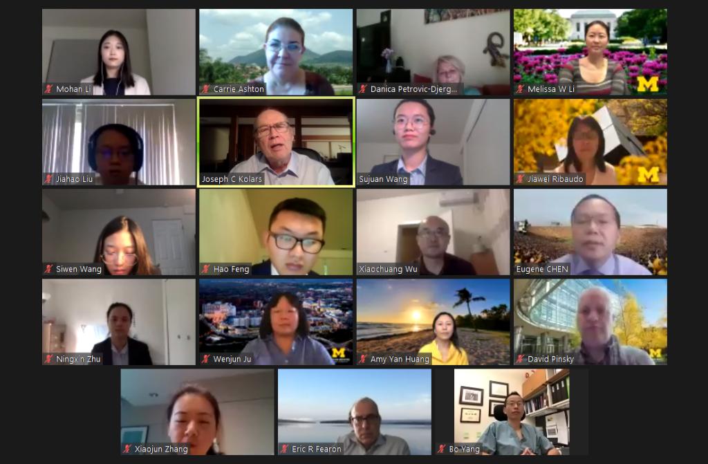 9月16日早上8点,美国密西根大学医学院为2019年谈球吧赴密大学习的2013级临床医学八年制学生召开线上学业报告会。密西根大学医学院教育和全球合作资深副院长Joseph C. Kolars教授、心脏外科系基础及转化研究副主任陈育庆教授、癌症中心主任Eric Fearon教授、心血管中心主任David Pinsky教授、密西根大学医学院全体湘雅学生的导师们、湘雅医学院副院长吴晓创以及在密西根大学交流的全体13级八年制项目学生共40人参加会议。陈育庆教授主持会议。