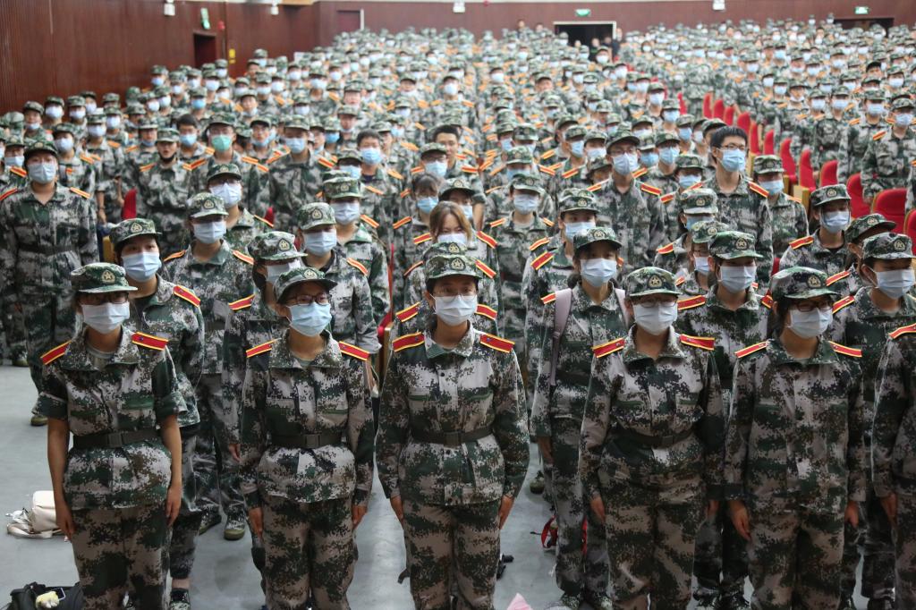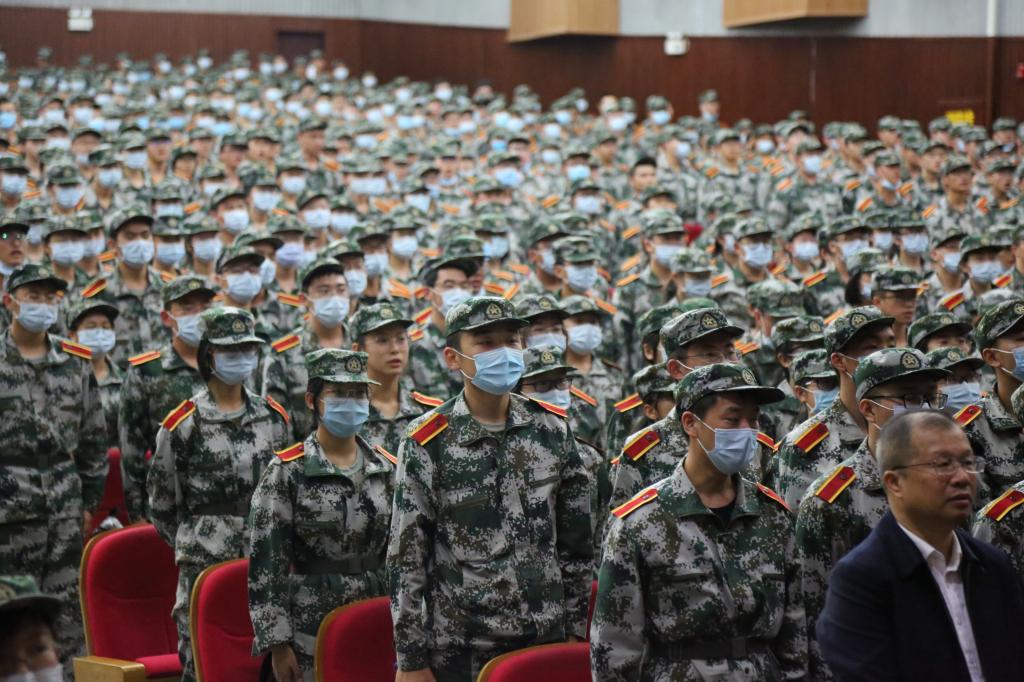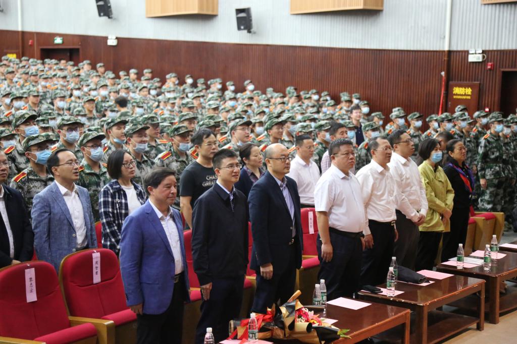 正在台上激情演讲的便是中南大学湘雅二医院副院长徐军美教授。这位武汉方舱战疫的英雄正在用亲身经历给谈球吧2020级千余名身着军装的新生进行入校教育。