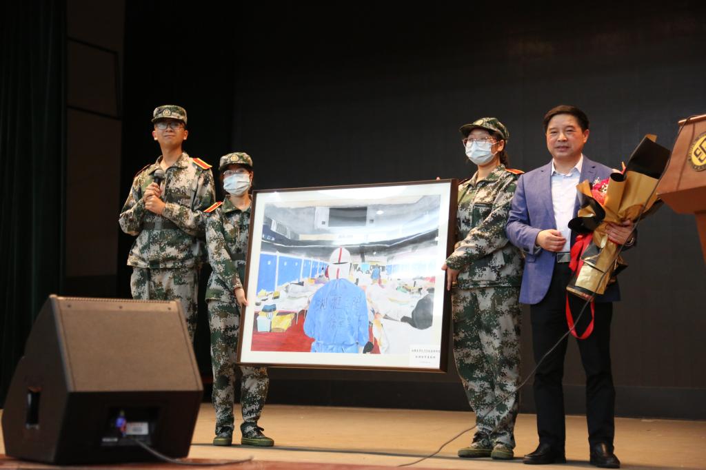 最后,徐军美教授带来了一场直击人心的题为“方舱战疫”主题教育报告。他从疫情骤起、临危建舱、立舱济世、方舱春暖、见证英雄五个方面,将自己和团队亲身经历的惊心动魄的一线战疫故事生动地展现在学生面前。台下的学生凝神听讲,时而被故事打动而情不自禁地鼓掌,时而被他艰辛时刻的幽默乐观所逗笑,时而拿出手机拍下珍贵的图片和文字。