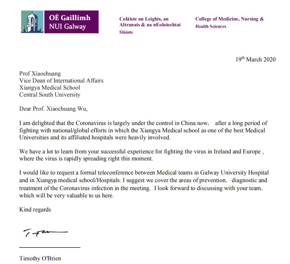 此次线上会议的召开源于爱尔兰国立高威大学医学院院长Timothy O’Brein教授发来的一封请求信,信中说道,很高兴看到中国对疫情已经进行了有效控制,作为中国最好的医学院和医院,湘雅在中国的抗疫斗争中做出了大量贡献,希望能够学习湘雅、学习中国关于疫情防控与救治的成功经验,并运用到爱尔兰疫情斗争中。对此,谈球吧会同中南大学国际合作交流处、医院管理处立即召集相关专家教授举行疫情防控经验国际分享会,以回应爱尔兰的邀请。参会专家包括中南大学湘雅二医院副院长、武昌方舱医院副院长徐军美教授,中南大学湘雅公共卫生学院院长胡国清教授,中南大学湘雅医院感染控制中心主任、中央指导组医疗救治组专家、首位驰援湖北的湖南专家吴安华教授,中南大学人事处副处长、中南大学湘雅医院感染病与肝病科副主任彭仕芳教授,中南大学湘雅三医院危急重症医学中心主任杨明施教授,中南大学湘雅医院呼吸科副主任孟婕教授。