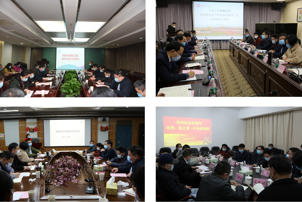 调研的各二级单位主要领导、教学科研工作相关部门负责人参加调研座谈会,分管教学、科研工作的副院长分别就疫情期间医学教学和科研攻关工作开展情况作了简要汇报。湘雅医学院领导班子成员分别就疫情期间医学教育、研究生、科研及学生管理工作的整体情况进行通报,并对医学本科生(含八年制)及研究生的线上教学、毕业生指导、学生分批返校准备以及新冠肺炎相关科研攻关工作提出了具体要求。与会人员围绕疫情期间医学教学和科研工作如何开展以及存在的问题进行研讨交流。