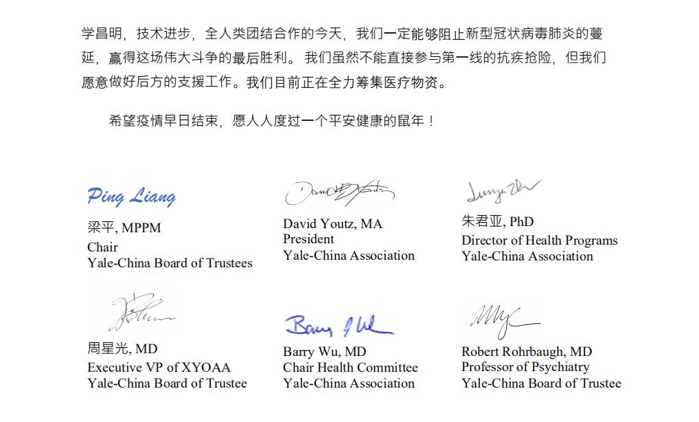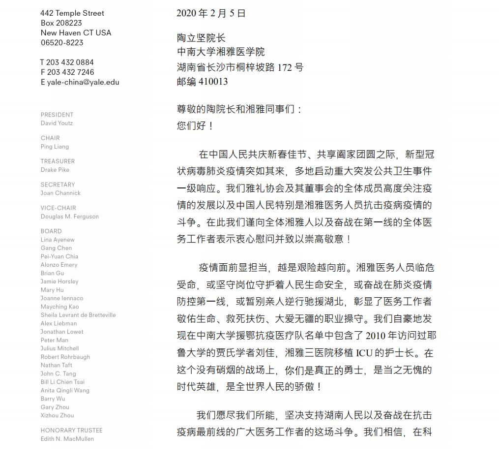 美国雅礼协会来信,愿与湘雅人一起共同抗击疫情