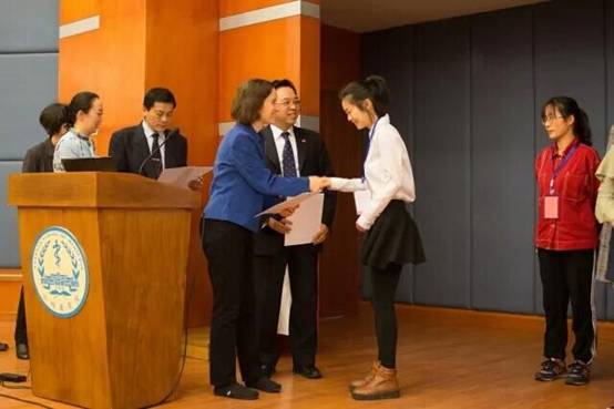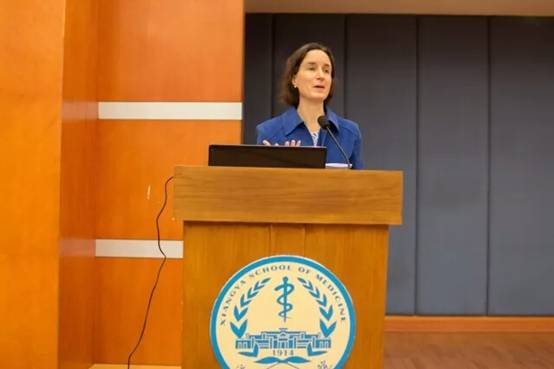 随后,雅礼协会健康项目总监Helen女士上台致辞。她谈到,今年的年会也是一场学术峰会——中美卫生职业教育和职业发展论坛。今天,各位嘉宾同聚一堂,一起庆祝双方学术交流的进展,庆祝各位卓越的学生们获得奖学金,更感谢湘雅海外的各位校友能够出席本次年会。