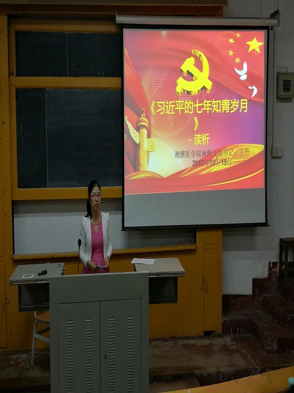 为迎接党的十九大胜利召开,了解十九大会议任务及内容,10月19日下午,湘雅医学院麻醉支部于湘雅医学院老校区北院十教室开展了以“坚定理想信念,做新一代青年”为主题的党日活动。支部书记王丹老师以及全体党员参加了本次活动。