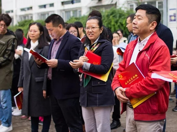 紧接着,到会的学生党员代表们,与老师们一起在党旗前重温入党誓词,并由丁红珊副书记讲话。丁书记表示,看完十九大的开幕会后重温誓词,热血沸腾,感慨万千。