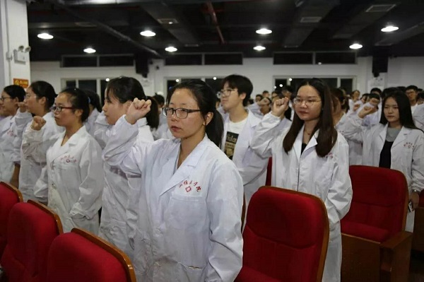 接着,湘雅医学院学生会主席张子南同学带领全体同学进行了医学生宣誓。宣誓过后,相关领导为学生代表们授予了象征医学光荣圣洁的白大褂。张思维同学则作为16级优秀学生代表上台发言,并带领全体同学朗诵了一首《白衣礼赞》,表达了新一代湘雅人誓要致力医学,致敬生命,书写湘雅新未来的坚定决心。