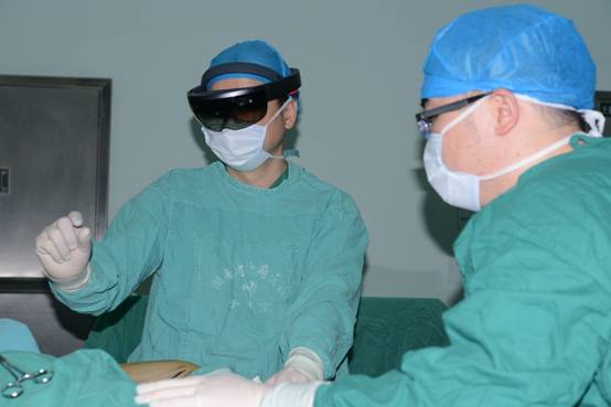 周晓书记介绍说:随着3D打印技术在医疗领域的快速发展,3D打印技术已经广泛应用于肿瘤整形外科。三维建模在肿瘤切除和皮瓣修复中的应用有助于进行精确的术前规划,指导手术方案的制定,提高手术的安全性。但是传统的三维建模无法实现在术中实时指导手术,因此如何把计算机里的设计方案在手术台上实时精准地实施,是困扰肿瘤整形外科医生的问题。Holoens眼镜的出现很好的弥补了三维建模这一不足。“就跟你的手术视野一样的手术眼镜屏幕”是对HoloLens眼镜的最佳形容。这例手术推动了国内外相关医学专业领域多项技术的发展,充分运用3D技术重建了血管位置和数量、肿瘤大小、位置和侵犯范围,更制备了3D手术导板使手术进一步精细化,多学科合作结合先进3D技术为各种难治性肿瘤整形修复提供了新的思路和经验。就现实导航手术来说,HoloLens在肿瘤整形外科领域已经到了堪用的地步,对于一个跨时代的产品来说,这就够了。第一代产品只要是“好看而无用”的就很好了,因为前景在那里放着,但是根据目前我们应用三维重建技术和Mr HoloLens混合现实技术的情况看,这些先进科技与临床经验和技术的融合要比预想的效果好得多,值得进一步研究并拓展应用。