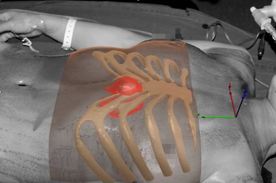 有了这个增强现实技术,术中主刀医师不仅可以现实下直观大致观察肿瘤表面形态、大小等实际情况,而且可以在增强现实技术虚拟的图象上精准判断肿瘤需切除范围、肿瘤血运、以及肿瘤深面与心脏距离等,从而设计手术方案、模拟手术操作,手术难度及手术风险大大降低。