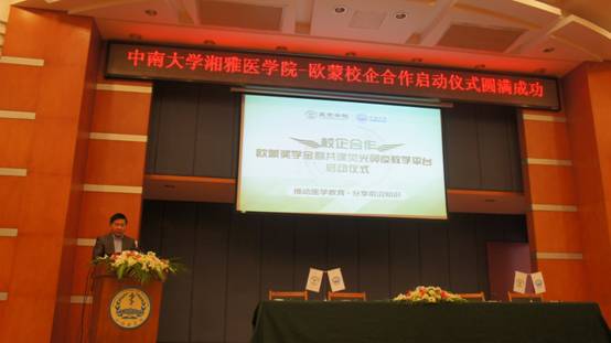 何庆南副院长、舒衡平副院长分别同李川总裁、卢洁院长在校企合作协议、仪器无偿租借协议上交换签字,双方代表合影留念。随后,现场师生一起观看了欧蒙公司的宣传片,了解了公司强劲的综合实力与美好的发展前景,也充分感受了欧蒙公司的“奉献社会、和谐发展”的企业使命以及“科技创新造就卓越品质”的企业理念。最后、李川总裁发表了“机会属于有准备并立即行动的人”的精彩演讲。