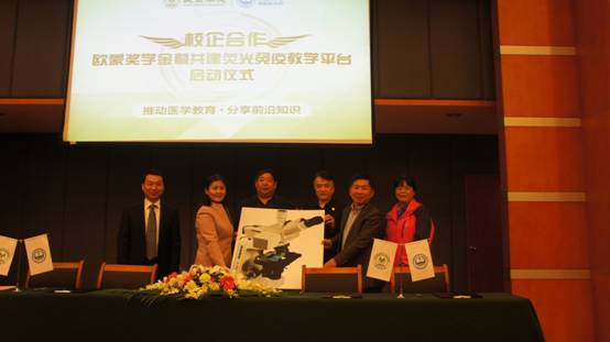2016年12月27日上午,谈球吧医学检验系与欧蒙校企合作签约仪式在谈球吧福庆楼报告厅隆重举行。欧蒙诊断(中国)有限公司为医学检验系捐赠荧光免疫教学平台并设立奖学金。