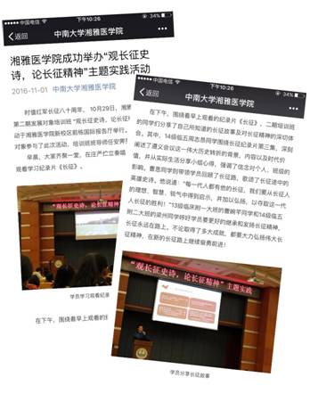 湘雅医学院通过以上内容丰富、形式多样的长征精神系列活动学习与实践拓展了全院红色宣传教育的覆盖面和辐射面,增强了红色文化的影响力和感染力,不仅丰富了同学们的课外生活,而且寓教于乐、取得了良好的宣传教育效果,对于大力弘扬长征精神、积极传承红色基因、扎实推进“两学一做”、强力推进优良学风建设,都将起到积极的促进作用。