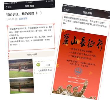 宣传方面,充分利用学院网站、学院官方微信公众号、官方微博、各年级分会与各班微信公众号与微博等信息平台开展线上教育活动,使同学们感受红色教育熏陶,接受革命精神洗礼,继承和发扬革命先辈的爱国精神与奉献精神,在全院形成浓厚的舆论氛围。学院官方网站连续刊登三篇“学长征精神,做红色传人”的学生优秀演讲稿;学院官方微信公众号与各年级分会微信公众号陆续发布关于长征精神的系列推送;16级各班的微信公众号与微博都对“传承长征魂、共筑中国梦”的主题班会进行了大量的宣传与报道。