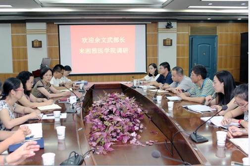 2016年9月27日下午3点,校学工部余文武部长到湘雅医学院调研学生工作,在湘雅医学院新校区后栋八楼一会议室就学生工作情况听取了学院汇报。参加此次会议的领导老师有校学工部余文武部长,院党委张步新书记,全体辅导员,会议由院党委丁红珊副书记主持。