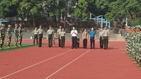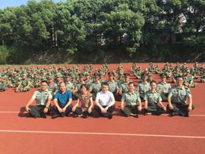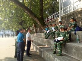 湘雅医学院领导及老师于上午九时来到军训点。尽管天气炎热,21连、22连同学们还是在坚持训练,或站着军姿,或练习着方阵。领导老师们与军训同学们零距离接触,问候了同学们在军训期间的生活状况。老师们还注意到操场边因为伤病不能参加军训的同学,详细地询问了他们的身体状况,嘱咐同学们要注意身体,学会照顾自己。