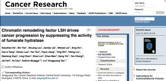 国际著名学术期刊《肿瘤研究》(Cancer Research)(影响因子9.329)于2016年6月在线发表了我校肿瘤研究所陶永光教授课题组关于染色质修饰调控的最新结果Chromatin remodeling factor LSH drives cancer progression by suppressing the activity of fumarate hydratase, 该研究揭示了染色质修饰涉及上皮细胞-间质转化。这是该课题组继2015年在Oncogene发表了研究性论文之后的又一力作。