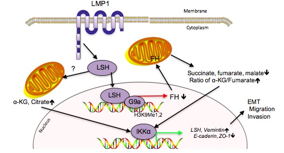 染色质修饰对上皮细胞-间质转化(EMT)起关键作用,而EMT赋予肿瘤细胞潜在的转移特性。该课题组以中国高发肿瘤-鼻咽癌为模型,报道了染色质重塑蛋白LSH在鼻咽癌中表达增高,并受Epsterin-Barr Virus编码的瘤蛋白潜伏膜蛋白1(LMP1)调控。 LSH能够体内外促进肿瘤的恶性演进,这种作用部分通过调控延胡索酸酶(FH,三羧酸循环中的一个核心组成部分)的表达。LSH可直接结合到FH启动子区,并招募表观遗传沉默因子G9a来共同抑制FH的转录。 RNA干扰介导的FH沉默能够模拟LSH过表达效应,从而确定FH是LSH下游的一个效应分子。在此基础上,进一步发现三羧酸循环中间代谢产物α-酮戊二酸和柠檬酸是鼻咽癌细胞潜在的恶性特征,它们部分通过改变IKKα依赖的EMT基因的表达。在这种方式下,LSH通过改变肿瘤细胞代谢而促使EMT的发生,从而更进一步促进鼻咽癌的恶性演进。