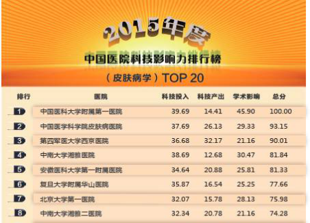 最近揭晓的中国医学科学院“2015年度中国医院科技影响力排行榜(皮肤科)”传来一个令人振奋的好消息——中南大学湘雅医院皮肤科排名全国第四,湘雅二医院排名全国第八,这是湖南省皮肤科科技影响力全国排名的最佳名次,充分彰显了湘雅皮肤科在全国的学术地位与能力。
