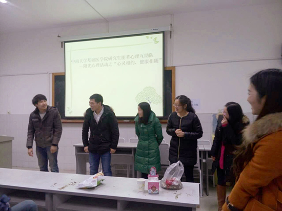 2015年12月24日晚上18点,由中南大学基础医学院研究生心理互助队举办的“心灵相约,健康相随”阳光心理活动在湘雅医学院后栋352教室顺利进行。参加本次活动的主要成员有基础医学院心理互助队全体队员以及部分研究生。本次活动分为工作的汇报评价及指导总结、心理电影观赏、团队游戏三个环节。