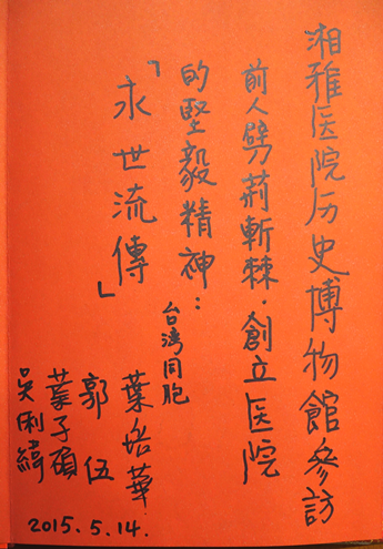 应原全国政协常委、现湖南省政府参事室参事、湘雅医学院曹亚教授之约,5月15日下午,台湾客人叶培华等一行四人前来参观湘雅医学院院史展览。在约两小时的参观中,学校档案馆校史研究室的工作人员就双方感兴趣的历史问题,与客人们进行了广泛交流。之后,台湾客人留言并签名存馆,表达了他们对湘雅医学院百年办学史的景仰与良好祝愿。曹亚教授不仅为客人们讲解了湘雅的对外交流史,而且与湘雅医院齐范教授等全程陪同客人们在院史展览馆的活动。