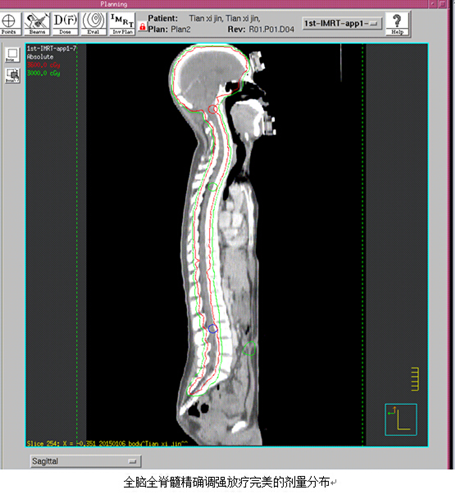 2015年1月至2015年3月,两例全脑全脊髓的调强放疗在谈球吧附属肿瘤医院(湖南省肿瘤医院)放疗综合科6号加速器完美实施。这种方法克服了传统放疗照射方法剂量难以把握的缺点,在保护脊髓等正常器官,又能保证足够的剂量以达到治疗效果,可谓“一举两得”给髓母细胞瘤、颅内原发生殖细胞瘤、中枢神经系统恶性淋巴瘤等患者带给更佳治疗效果。