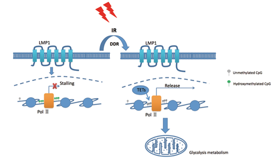 大约60%的失活基因存在RNA聚合酶II的阻滞。EB病毒编码的瘤蛋白LMP1通过RNA聚合酶Ⅱ阻滞这种新型转录调控方式抑制鼻咽癌中HOX基因的表达,形成鼻咽癌特有的Hox基因表达谱,进而影响鼻咽癌的发生发展。鼻咽癌细胞系经过放射处理之后,被EBV-LMP1抑制的Hox基因重新恢复表达,其机制涉及到DNA去甲基化酶TET3介导的DNA去甲基化的染色质修饰调控过程。外源性导入HoxC8基因后可抑制鼻咽癌细胞系在体外和动物模型中的增殖,并且抑制糖酵解相关基因以及促进三羧酸循环相关基因表达,表明HoxC8可逆转“瓦伯格效应”从而具有肿瘤抑制作用。