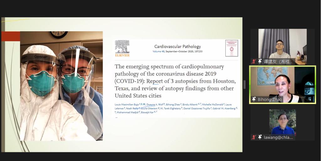 会议中,主讲人赵必红教授以“新冠病人呼吸系统的损伤”为主题,详细介绍了新冠肺炎的病理生理、发病机制及临床表现,展示了新冠肺炎患者的肺部特征及主要病理变化,并在互动环节中一一解答了湘雅专家、学生提出的相关问题。