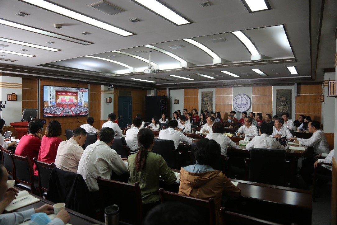 10时,在听到大会直播“全体起立”的指令后,会场全体参会人员站起身来,跟着伴奏高唱国歌。随后,湘雅医学院全体干部职工开始观看、聆听习近平总书记的重要报告。观看会场整体气氛庄严且热烈,在激动人心之处,时常响起热烈的掌声。