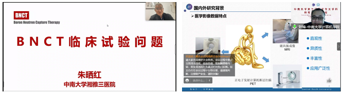 开幕式后的学术报告环节由湘雅医学院副院长段绍斌主持。湘雅三医院朱晒红教授、计算机学院刘锦副教授分别作题为“硼中子俘获疗法临床试验问题”、“脑疾病智能辅助诊断”的主题报告,分享在团队医工、医理等交叉学科领域的最新研究进展。