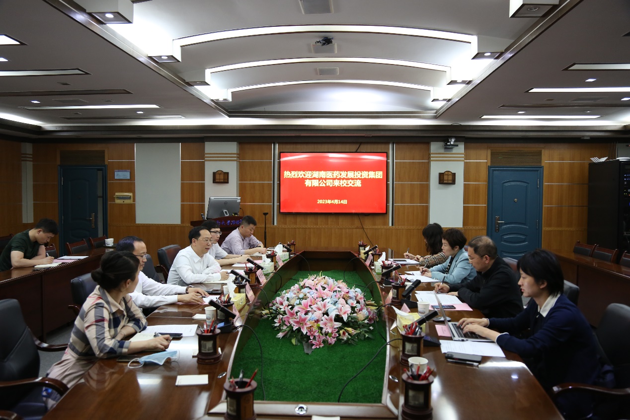 4月14日,湖南医药发展投资集团有限公司副总经理莫众带队来湘雅医学院交流。双方在孝骞楼八楼二会议室举行座谈会。湘雅医学院党委书记常实、副院长黄志军、湘雅三医院学科建设与规划办主任方丽参加会议。座谈会由黄志军主持。