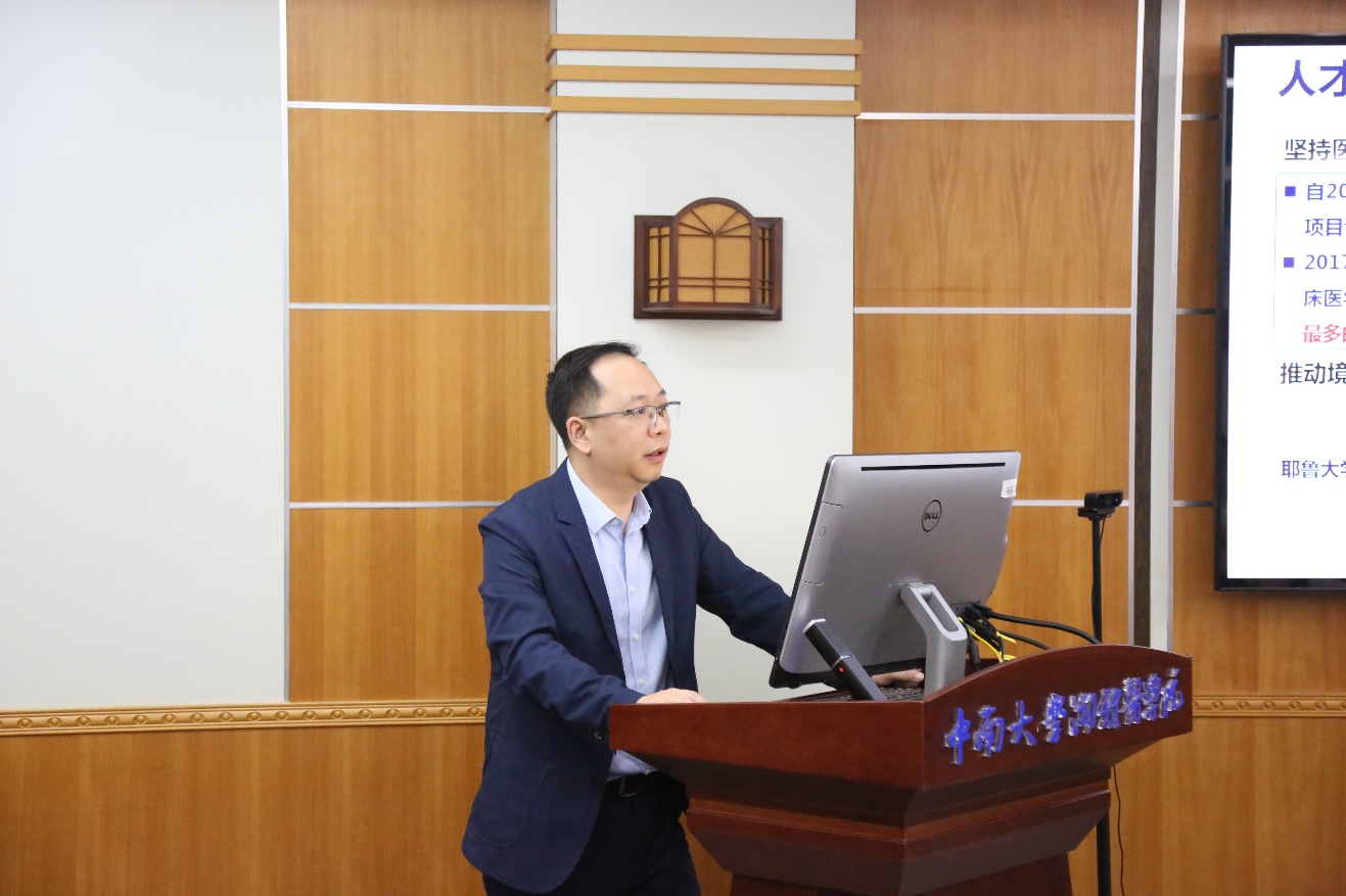 会上,湘雅医学院副院长黄志军介绍了湘雅医学目前的发展情况,并从“1341”建设思路、建设现状、近期发展计划等几方面介绍了芙蓉实验室的建设情况。刘军等对湘雅医学的发展现状及芙蓉实验室的建设情况表示了高度的肯定。