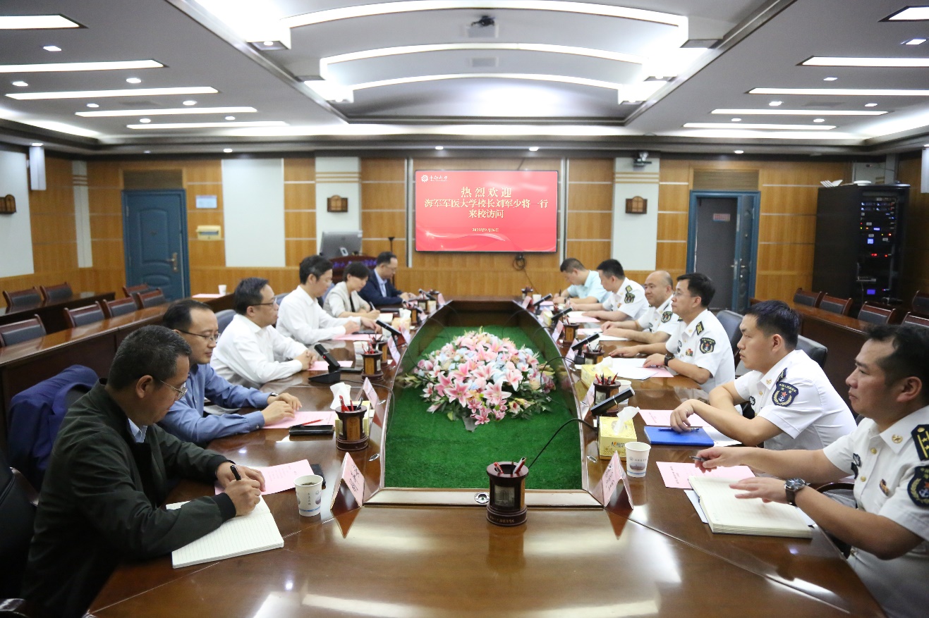 9月26日下午,海军军医大学少将校长刘军一行来到湘雅医学院进行访问,双方在湘雅新校区孝骞楼八楼二会议室举行了座谈会,中南大学常务副校长、湘雅医学院院长陈翔,副校长黎志宏出席会议。会议由黎志宏主持。