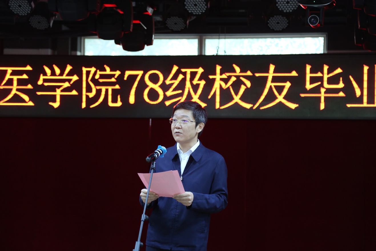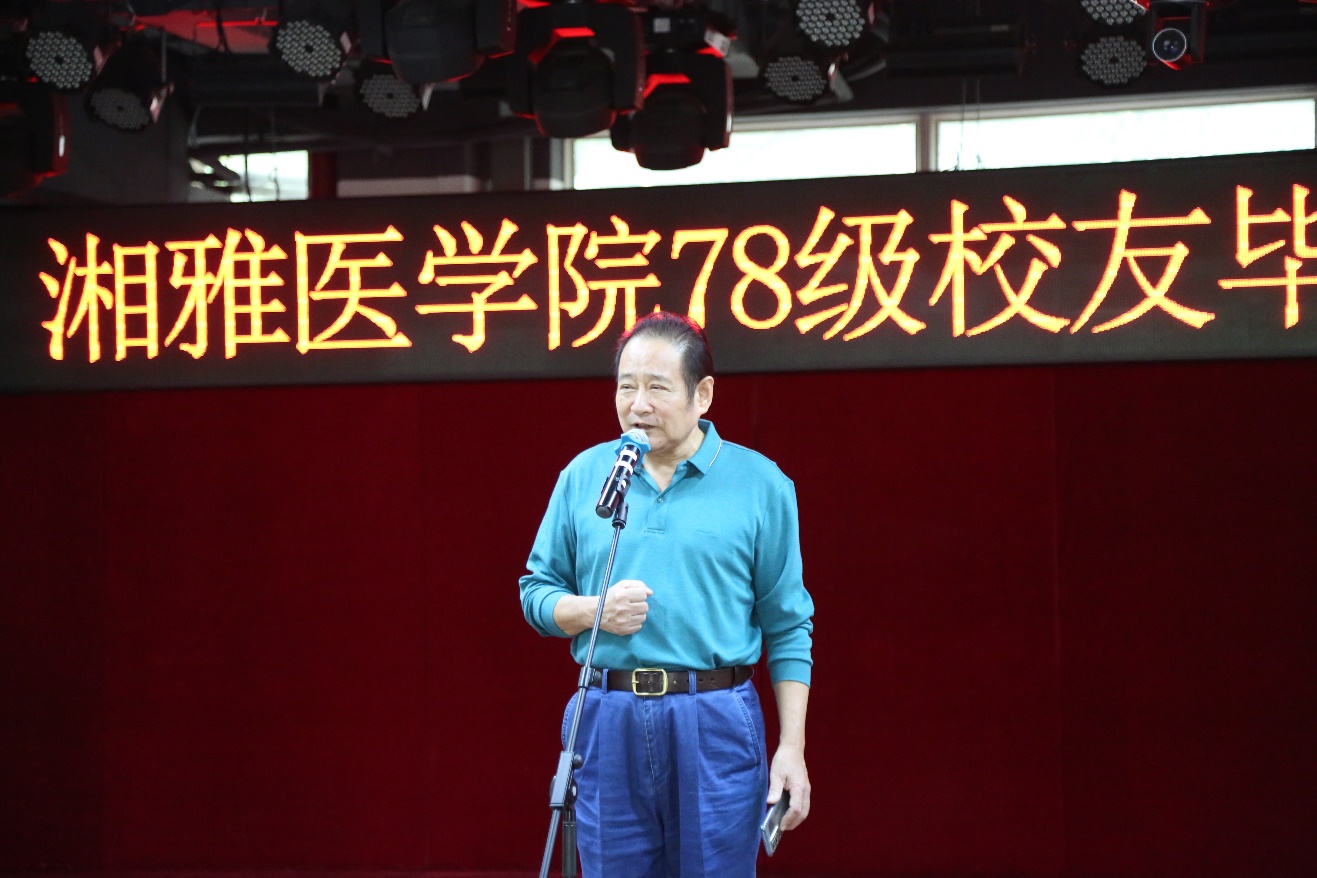 78级学生会主席齐海智作为校友代表发言。他讲校友们能在这里团聚十分难得,感恩母校培养之情,要继续为母校发展发光发热。“感恩母校,育吾成才”,78级八班王乐群校友一首铿锵的高歌和韵味十足的长诗《四十年的期待》获得热烈的掌声。在诗中,他回忆了求学时代学习与生活中的趣事、妙事。78级四班陈彪校友讲到,他毕业后辗转多地从医,始终难忘怀的就是母校深沉、厚重的优良传统,希望湘雅精神永续传承!