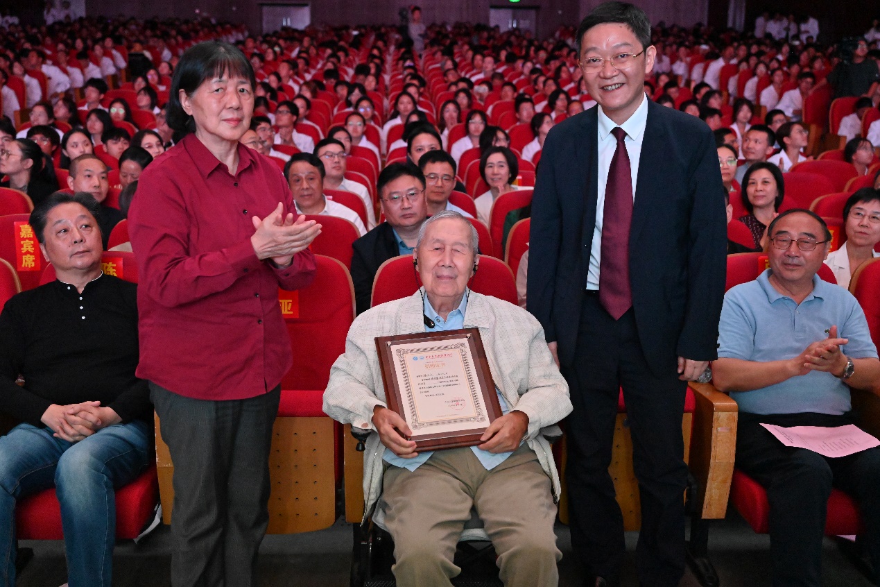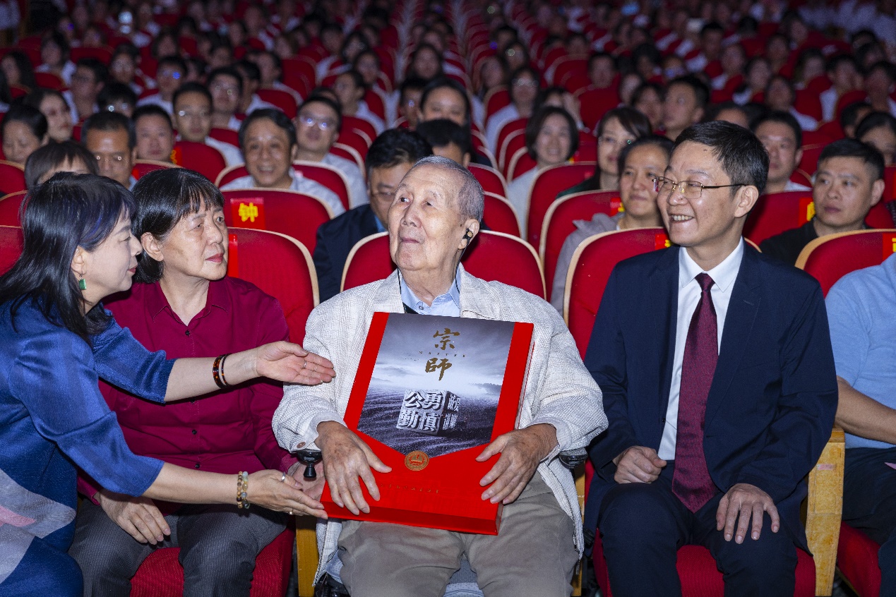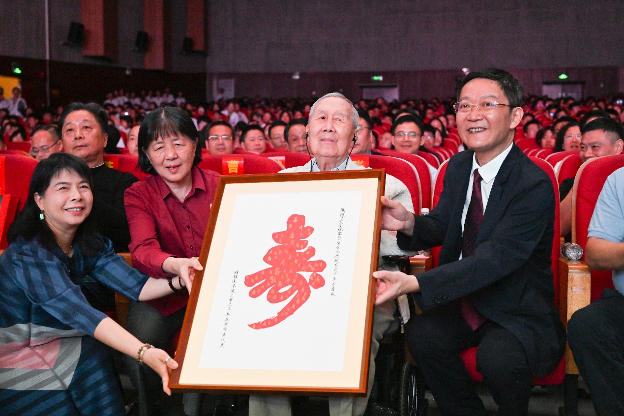 会上,他还向湘雅医学院捐赠了张孝骞老院长的两枚宝贵的私章、一本盖了印章的《医学伦理学》教材和一套老院长在美国留学时穿过的西装以及“最美奋斗者”奖章及证书。常实教授和曹亚教授为张友会老校友颁发了捐赠证书。这是庆祝湘雅医学院成立109年最好的贺礼,也是启动110周年院庆活动的最佳见证。张友会老校友深情地向同学们说到自己当军医的经历,并勉励同学们学以致用、不骄不躁,锻炼成为新的湘雅人!为感谢张友会老校友,湘雅医学院赠送给他一本画册《宗师》,是以张孝骞老院长在湘雅的宝贵影像为蓝本,由在校学生亲手绘制而成;还有存储着大型原创舞台剧《张孝骞》首演实况录像的优盘。今天也恰逢张友会老校友95岁寿诞,湘雅医学院的师生代表手书了95个寿字相赠,全场唱响生日歌,同学们打开的灯光让整个会场如同星光漫天的夜空,浪漫而又暖心。