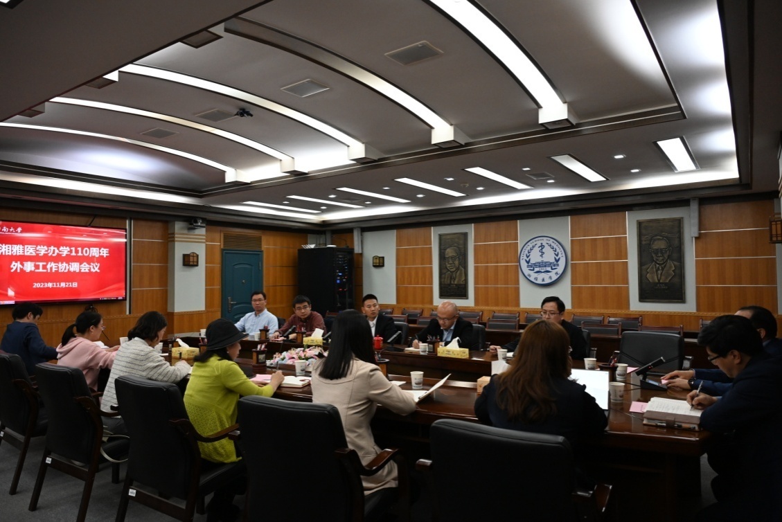 2023年11月21日下午,湘雅医学办学110周年外事工作协调会议在孝骞楼二会议室召开,湘雅医学院党委书记常实、国际合作与交流处处长殷刚、湘雅医学院副院长李学军,各二级学院、直属附属医院分管外事副院长,国际合作交流处引智办,湘雅医院、湘雅二医院、湘雅三医院国际合作与交流办公室相关负责人出席会议。会议由李学军主持。