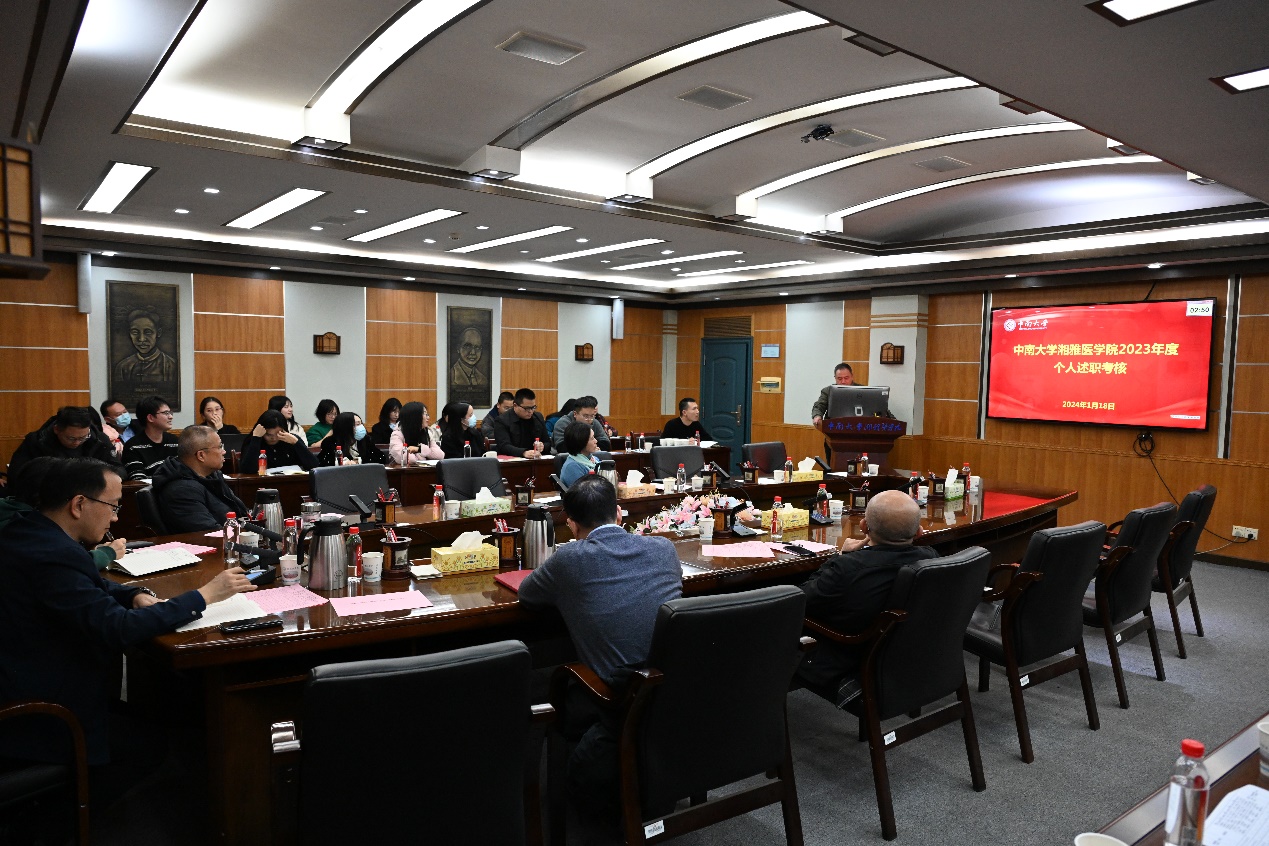 1月18日,湘雅医学院教职工2023年度个人述职大会在孝骞楼二会议室召开,湘雅医学院全体在家领导班子成员出席会议,全体教职工参加会议并在大会上述职。会议由党委书记常实主持。