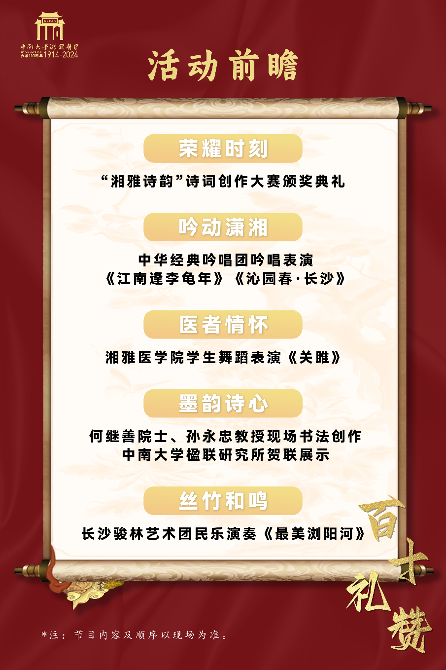 2024年是中南大学湘雅医学办学110周年。为深刻展现百十年历程,谈球吧、人文学院、中华经典吟唱研究与传播基地、南薰诗社联合举办诗词创作大赛系列活动。自大赛启动以来,我们收到了来自世界各地的诗词佳作,每一首作品都饱含着作者对湘雅的祝福、对医护的敬意和对诗词的热爱。