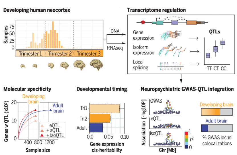 5月24日,《科学》(Science)在线发表题为“人类大脑发育过程中基因、异构体和剪接调控的跨祖先图谱(Cross-ancestry atlas of gene, isoform, and splicing regulation in the developing human brain)”的研究论文。加州大学洛杉矶分校(现宾州大学)Michael J. Gandal教授和中南大学生命科学学院刘春宇教授为文章共同通讯作者。