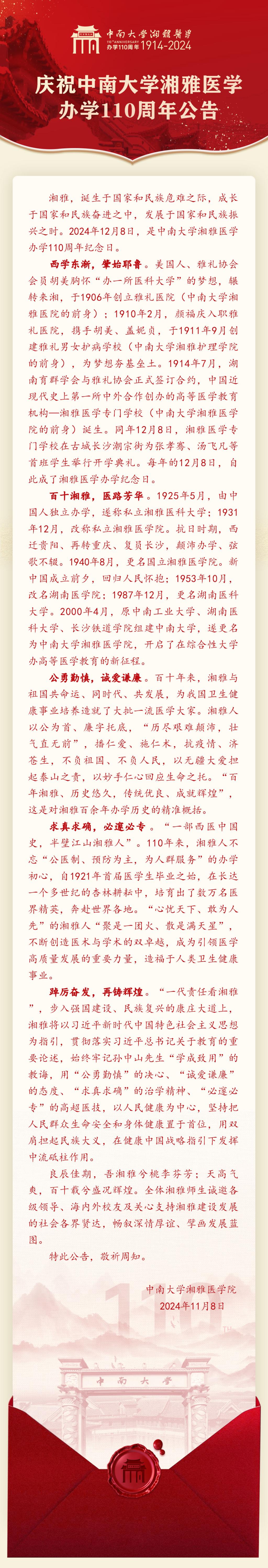 庆祝中南大学湘雅医学办学110周年公告