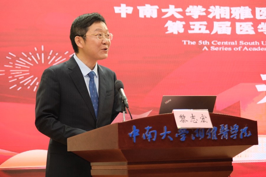 中南大学副校长黎志宏出席开幕式并致辞,他指出,交叉学科建设是解决重大现实问题的实际需求,也是推动高水平科技自立自强的重要举措。要以学科交叉为抓手,大力推进“新医科”建设,开展以医学难题为导向的多学科联合攻关,培养复合型创新人才,为“健康中国”奠定坚实的基础。