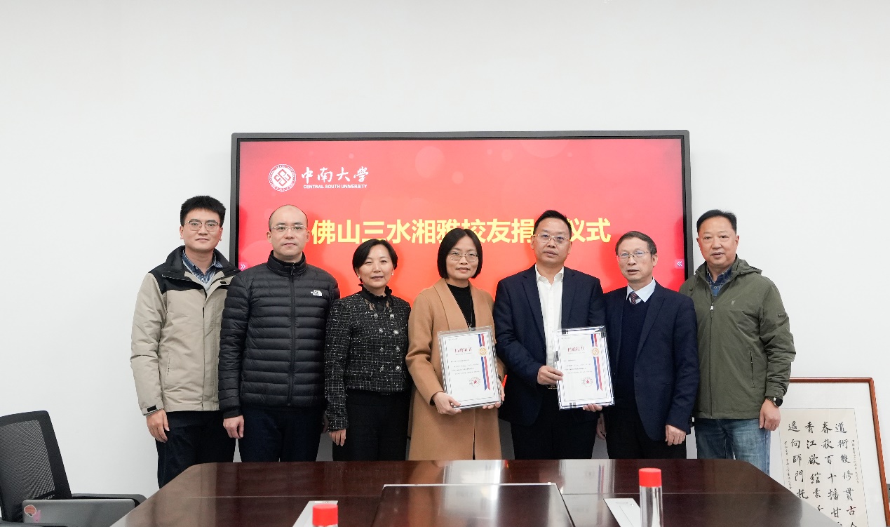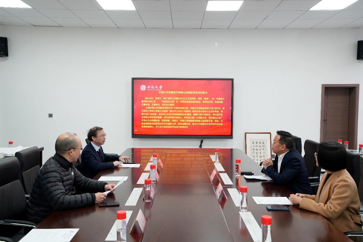 近日,佛山三水校友向母校捐资用于设立奖助学金。捐赠仪式在湘雅东校区教室楼会议室举行。湘雅92级校友李晚泉、93级校友黎娜作为代表出席了捐赠仪式。湘雅医学院常务副院长武明花、教育基金会秘书长刘宪军、资源拓展部部长李明志出席仪式。仪式由湘雅医学院副院长黄耿文主持。