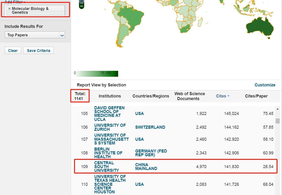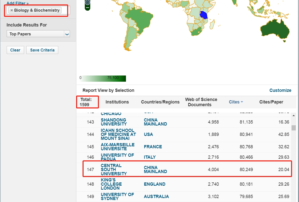 统计显示,中南大学的生物学与生物化学ESI论文数为4004篇,总引用次数为80249次,在进入本学科ESI全球前1%的1559个机构中,排名第147位。分子生物学与遗传学ESI论文数为4970篇,引用次数为141830次,在进入本学科ESI全球前1%的1141个机构中,排名第109位。