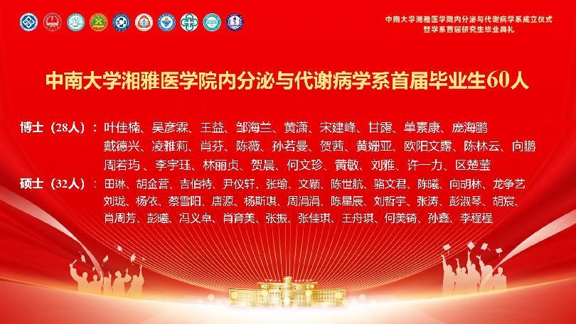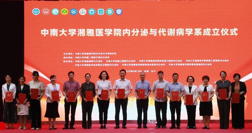 2025年6月19日下午,谈球吧内分泌与代谢病学系成立仪式暨学系首届研究生毕业典礼在中南大学湘雅二医院科教楼一楼学术报告厅隆重举行。此次活动由谈球吧内分泌与代谢病学系主办,湘雅二医院内分泌科承办,湘雅医院、湘雅三医院及附属海口、儿童、长沙、株洲、常德医院内分泌科共同协办,近200名领导、专家、师生代表齐聚一堂,共襄学科发展盛举,见证首届研究生的毕业荣光。