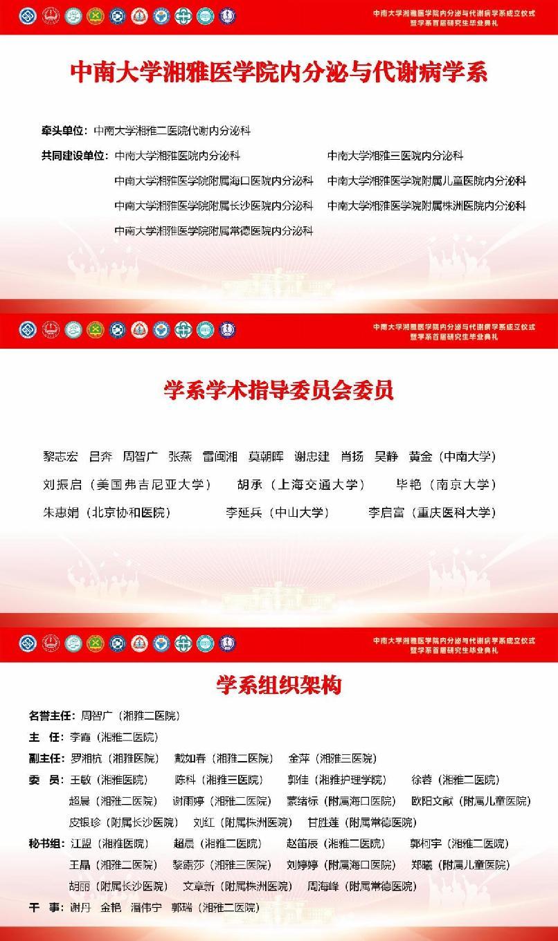下午15:00,活动在主持人——湘雅二医院代谢内分泌科医师赵笛辰、郭柯宇的热情开场中拉开帷幕。到场领导与嘉宾包括:中南大学党委常委黎志宏副校长,湘雅二医院党委柴湘平书记、张燕副院长、肖扬副院长,党委办公室龚亚军主任,医务部兼研究生办吴斯杰主任,教务部王奇缘主任,毕教办张伟志主任,党委学生工作办公室陈亮辉主任,院办谭胜蓝副主任,研究生部陈翔宇、陈明佳子副主任,第九党总支曾向阳书记,湘雅医院内分泌科雷闽湘、吴静教授,湘雅护理学院黄金教授,湘雅二医院代谢内分泌科李霞主任、戴如春副主任、谢忠建教授及谈球吧内分泌学系共同建设单位的主任们,教师及学生代表们。