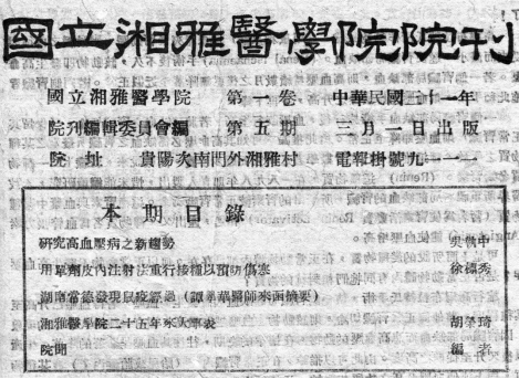 1942年3月,《国立湘雅医学院院刊》第1卷第5期刊载本院第12届毕业校友、常德广德医院院长谭学华的来信——《湖南常德发现鼠疫经过》,对外揭露日寇于1941年11月4日在常德空投细菌弹后,致鼠疫暴发、同胞惨死的罪行。