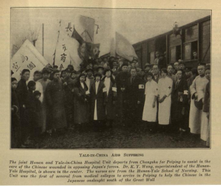 1931年,“九一八事变”爆发。随即,湘雅医学院将学生的体育课改授军事医学,并协助湖南高中以上学校军事训练委员会办理战地救护讲习班,培养战地医护人才。1933年3月,湘雅医学院组织两批医护北上支援抗战,王子玕院长亲率湘雅救护队赴北平,参加抗日长城之战的医疗救护工作。颜福庆先生在《申报》发表谈话称,湘雅医学院等国内各大医事机关“救护工作组织严密、费钱不多,收效尚大,各地保护人员精神极佳”。随着战事发展,战线逐渐南移。1935年9月,湘雅医学院组建战时服务团,并在长沙市北郊设立卫生事务所,为因抗战爆发自北南下的难民服务。