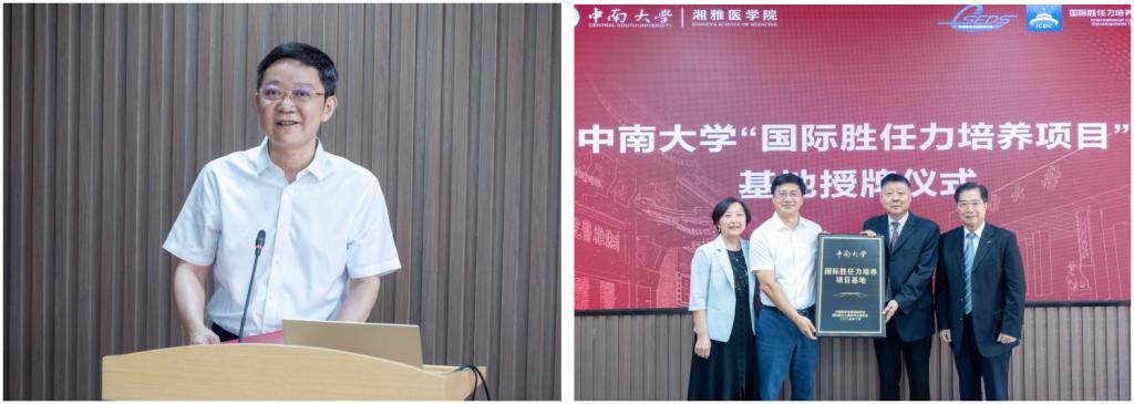 会上,黎志宏教授代表学校致欢迎辞。他强调,在全球卫生治理格局变革与教育强国战略推进背景下,湘雅医学院推进国际胜任力培养,既是深化医学教育国际化的关键举措,也是为国家卫生健康事业与全球公共卫生治理培育高素质人才的必然选择。随后,张宁博士、何昌垂博士共同为中南大学授予“国际胜任力培养项目基地”牌匾,武明花教授、殷刚教授代表学校接牌,标志着湘雅医学院国际胜任力培养从“课程试点”迈向“常态长效”,将为师生搭建更系统的国际化能力提升平台。