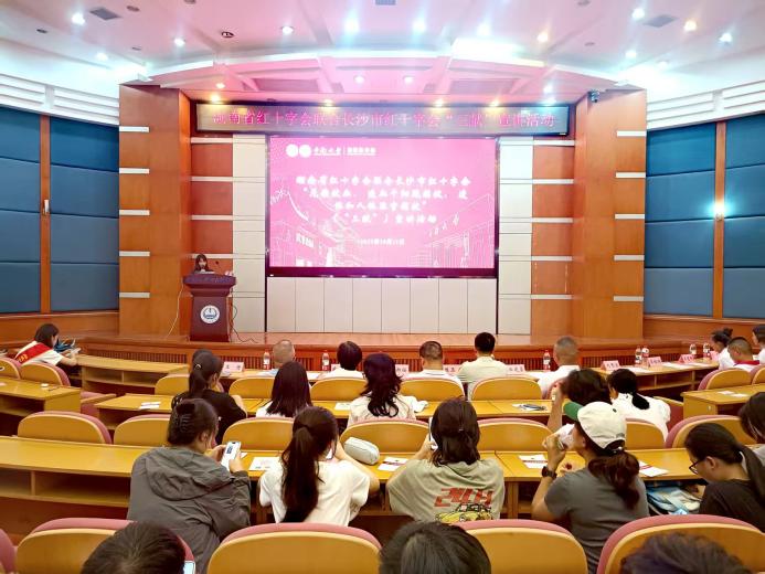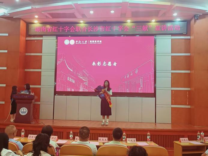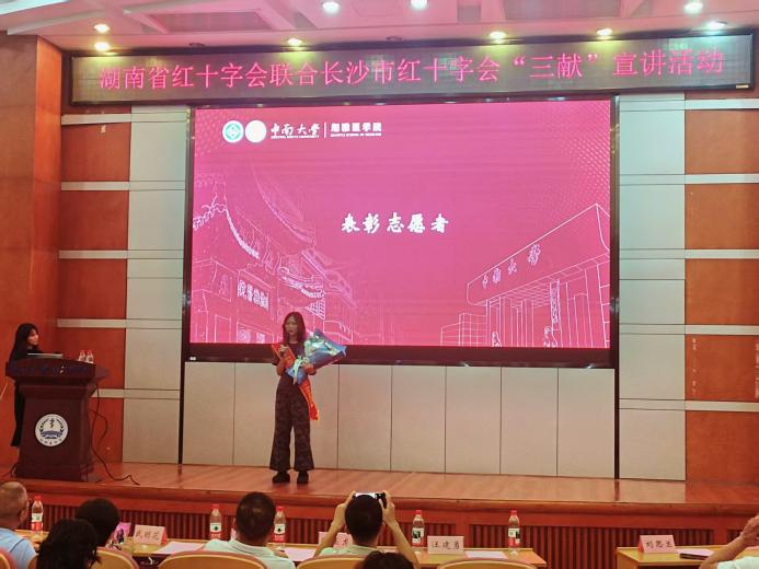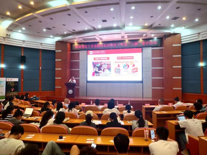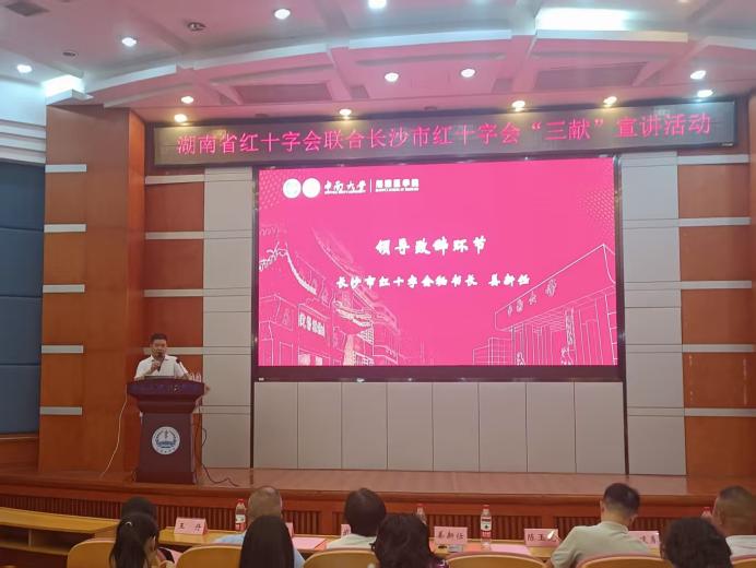 2025年10月11日下午14时30分,由湖南省红十字会与长沙市红十字会联合主办的“无偿献血、造血干细胞捐献、遗体和人体器官捐献”(以下简称“三献”)主题宣讲活动在中南大学杏林校区福庆楼四楼学术报告厅成功举行。湘雅医学院常务副院长武明花、长沙市红十字会秘书长姜新任、湘雅医学院党委副书记吴世明、湖南省红十字会器官捐献管理中心陈玉龙等领导嘉宾及师生代表共100余人参与活动,共同见证生命教育与公益精神的传承。活动由中南大学湘雅红十字会指导老师张先桃主持。