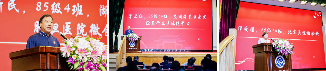 随后,4班尹新民、14班覃卫红、16班谭爱国三位同学作为1985级学生代表依次登台作主题分享。他们分别结合临床医学、预防医学、检验系的专业经历和个人工作经验,讲述了从懵懂学子到行业骨干的成长历程与人生感悟,字里行间满含对同窗情谊的深切珍视与感念,也饱含着对母校悉心培养的感恩与不舍。那些一起走过的日子,如今化作纸上的感激,字字句句,皆是心声。