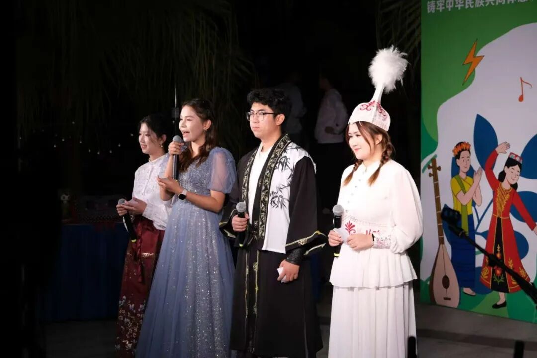 18:30,演出正式拉开序幕。多民族歌舞在灯光与音乐的交织中映入眼帘。灵动的舞姿、悠扬的旋律、热烈的节拍,构成一幅鲜活的文化长卷。现场不时响起合唱与互动环节,观众掌声雷动、齐声歌唱,热烈氛围一浪高过一浪。哈萨克族群舞《黑走马》承着轻松愉快乐曲入场,舞姿刚强有力,团结与自豪在旋律中共振;民乐演奏《权御天下》,传统乐器与流行热曲的结合迸发新活力;古丽尼嘎尔一支《阿图什赛乃姆》,舞步轻快,服饰华彩与节奏律动交织,视觉与听觉的双重盛宴;哈利老师的《欢乐跳起来》,台上台下手把手学动作,笑声与掌声把距离瞬间拉近……正式演出引得台下小伙伴情绪高涨,开放麦不停歇。部分同学即兴登台演唱《日不落》等歌曲,一齐融入欢乐和谐的氛围中。此时此地,人人都是主角,人人都是文化的传播官。