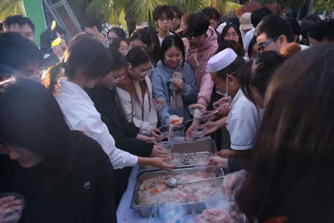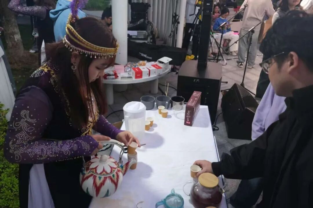 下午5:30,落幕的夕阳带走了天边的余晖,却点燃了同学们体悟民族风情的热情。随着体验活动正式开场,体验美食的队伍早早排起长龙。别具风味的手抓饭、麦香浓郁的新疆黄金馕饼,广受各位美食鉴赏家好评。藏族酥油茶的咸香与哈萨克族奶茶的醇厚,为每位过路人带去温暖,如同亲身体会远方的人们待客的热情。手捧奶茶,或与同行友人举杯共饮、或在悠悠茶香中独自感受,民族的风土人情都在品尝茶韵的那一刻缓缓展开。草原、雪山、牧场与生活智慧的无声故事,在茶雾缭绕间娓娓道来。